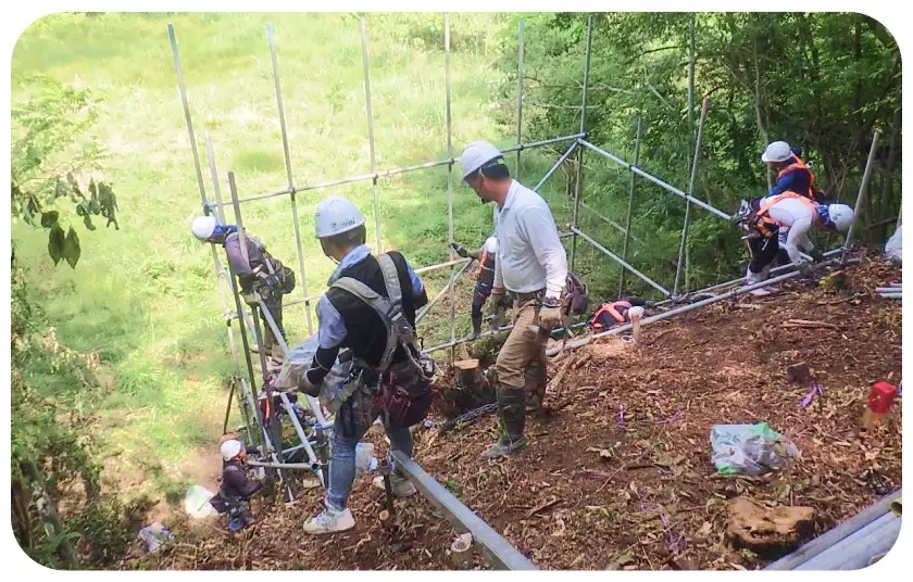 掘削用の機械を載せる足場を作成します。傾斜のある地面の場合は、掘削作業を問題なく行えるように、平地を作ります。大がかりな足場作成の場合は、大人数で対応します。